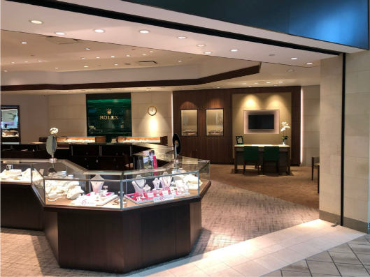 Ben Bridge Jeweler features a sophisticated interior with luxurious materials, ambient lighting, and well-curated showcases designed to create an inviting and elegant shopping atmosphere.