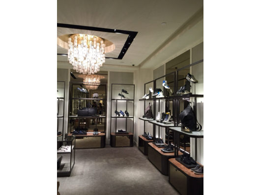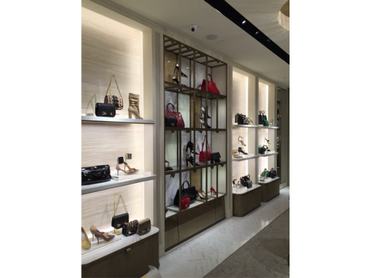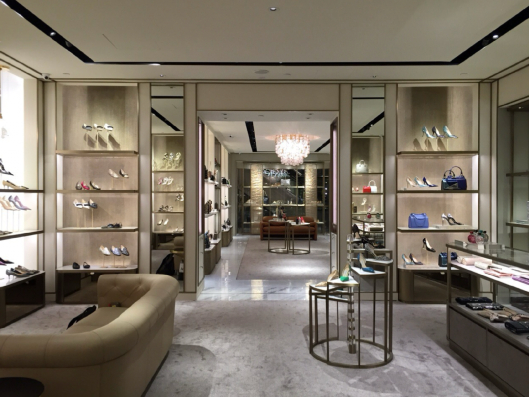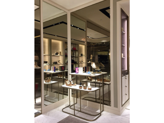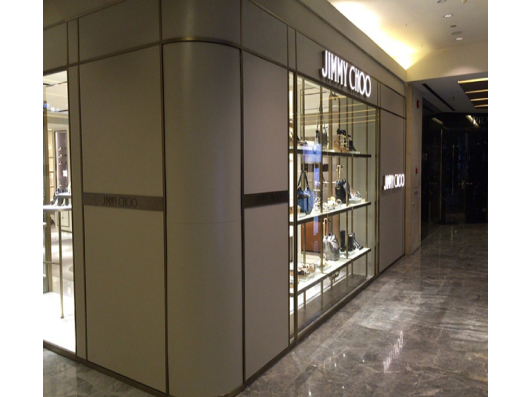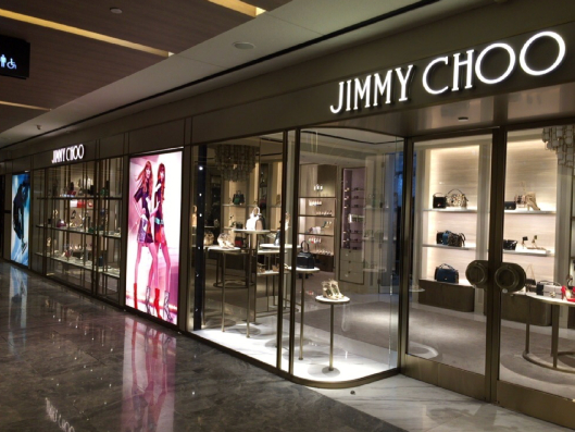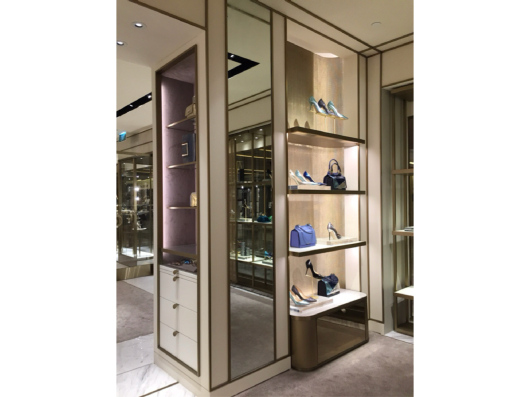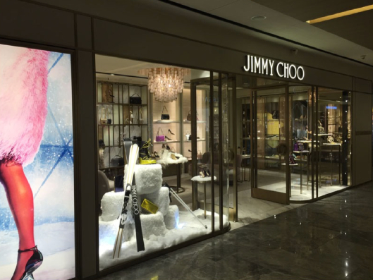 The Jimmy Choo store features a glamorous and contemporary interior, combining sleek finishes, elegant lighting, and stylish displays that reflect the brand’s luxury, sophistication, and fashion-forward aesthetic.