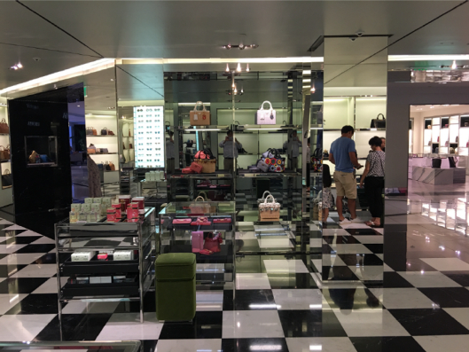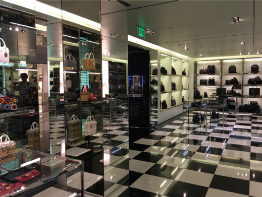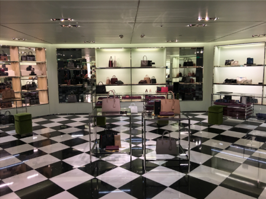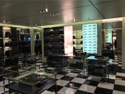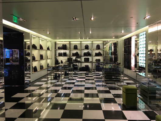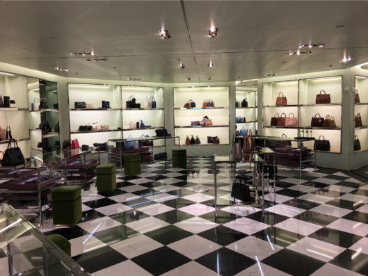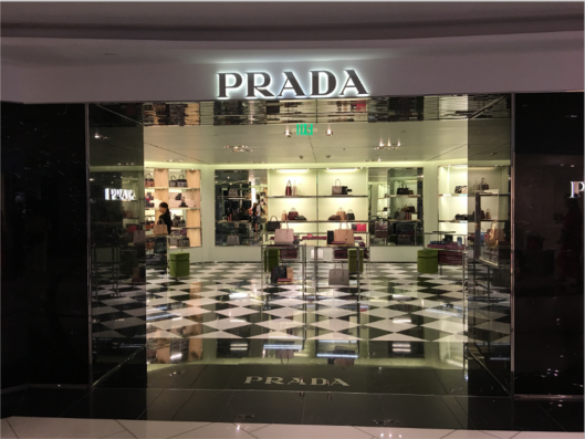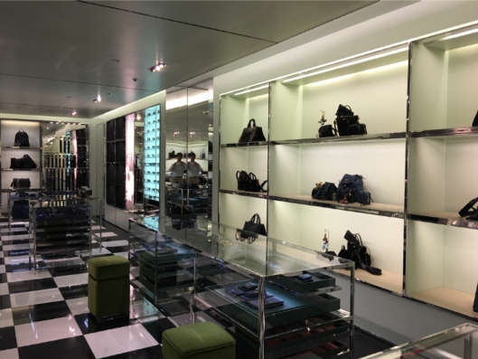 Prada features a sleek and contemporary interior design marked by clean lines, luxurious materials, and artistic detailing, reflecting the brand’s signature sophistication and modern elegance.