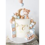 Featuring a handcrafted fondant teddy bear, pastel balloon toppers, and charming baby-themed elements like blocks and rattles, this cake is both visually stunning and irresistibly sweet. The soft blue and beige tones make it ideal for a boy’s celebration, capturing the innocence and wonder of early childhood beautifully.
