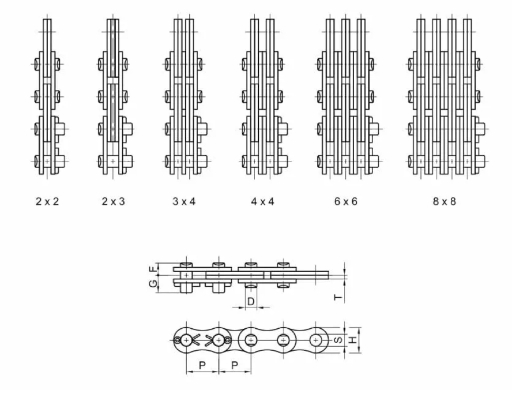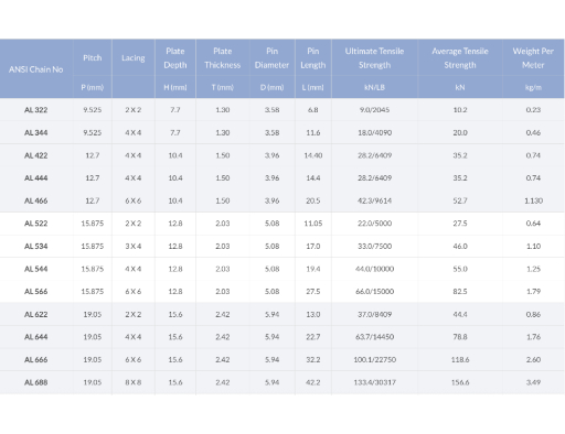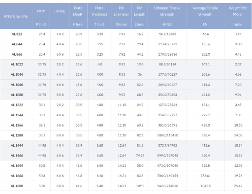 leaf chains, produced according to ISO 4347, DIN 8152, and NFE 26107 standards, follow a similar construction using roller chain components but are built to European specifications. Like the AL Series, the LL chain is also lightweight and intended for light-load lifting applications and machine tools.
