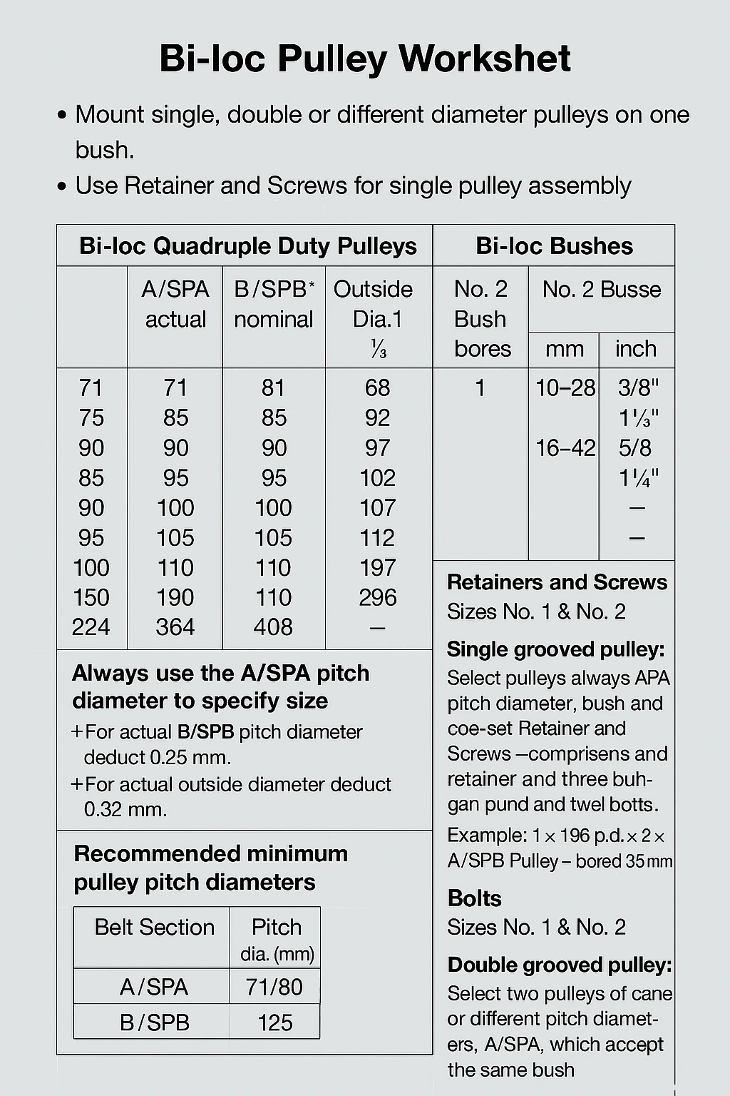 The Uni-Drive Bi-Loc range covers pulley sizes from APCD 71 mm to 450 mm, with an extensive selection of matching bushes held in ready stock to suit various shaft diameters.